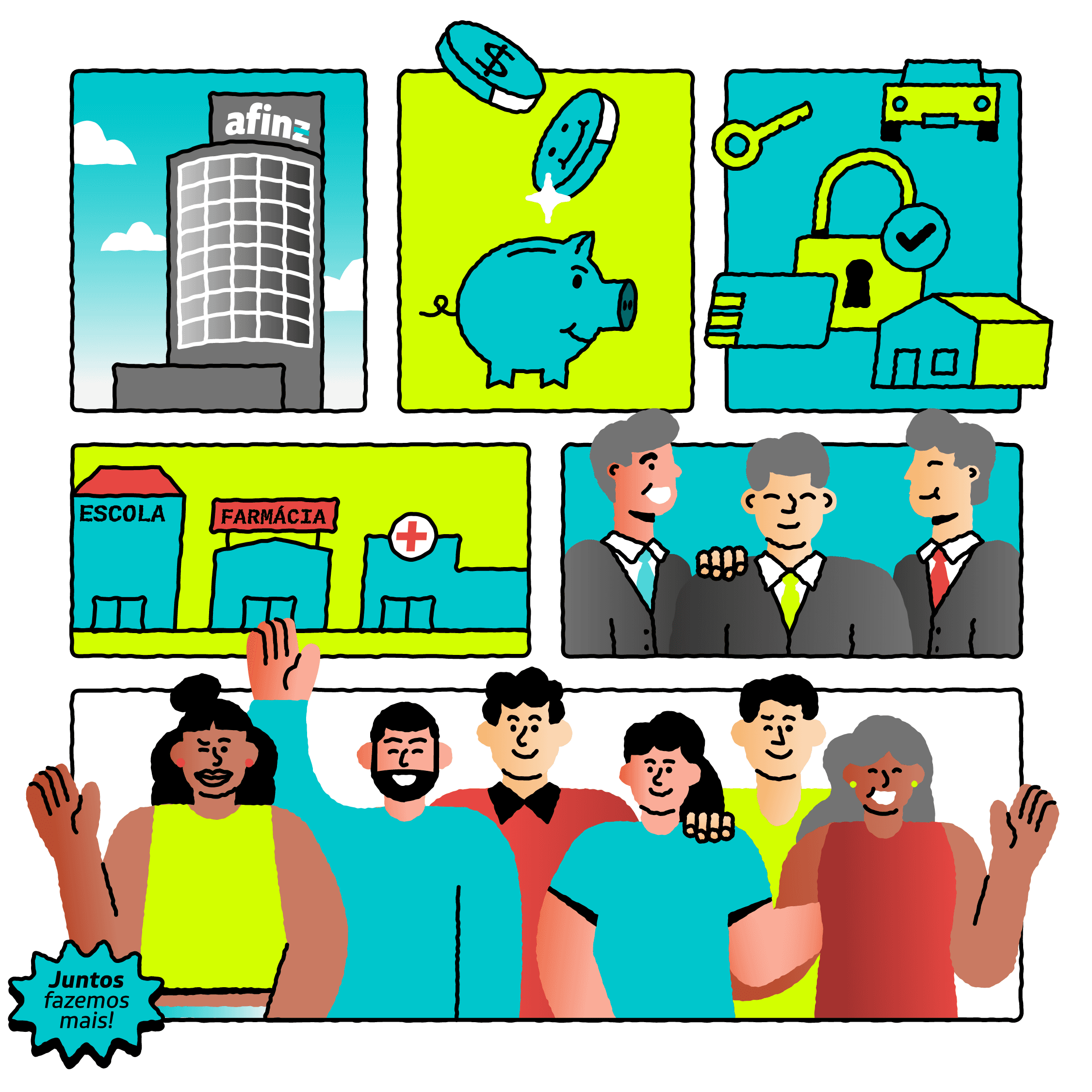PT - Para o Dia da Família na Afinz, desenvolvi uma série de ilustrações que contam a trajetória incrível da empresa, desde os tempos