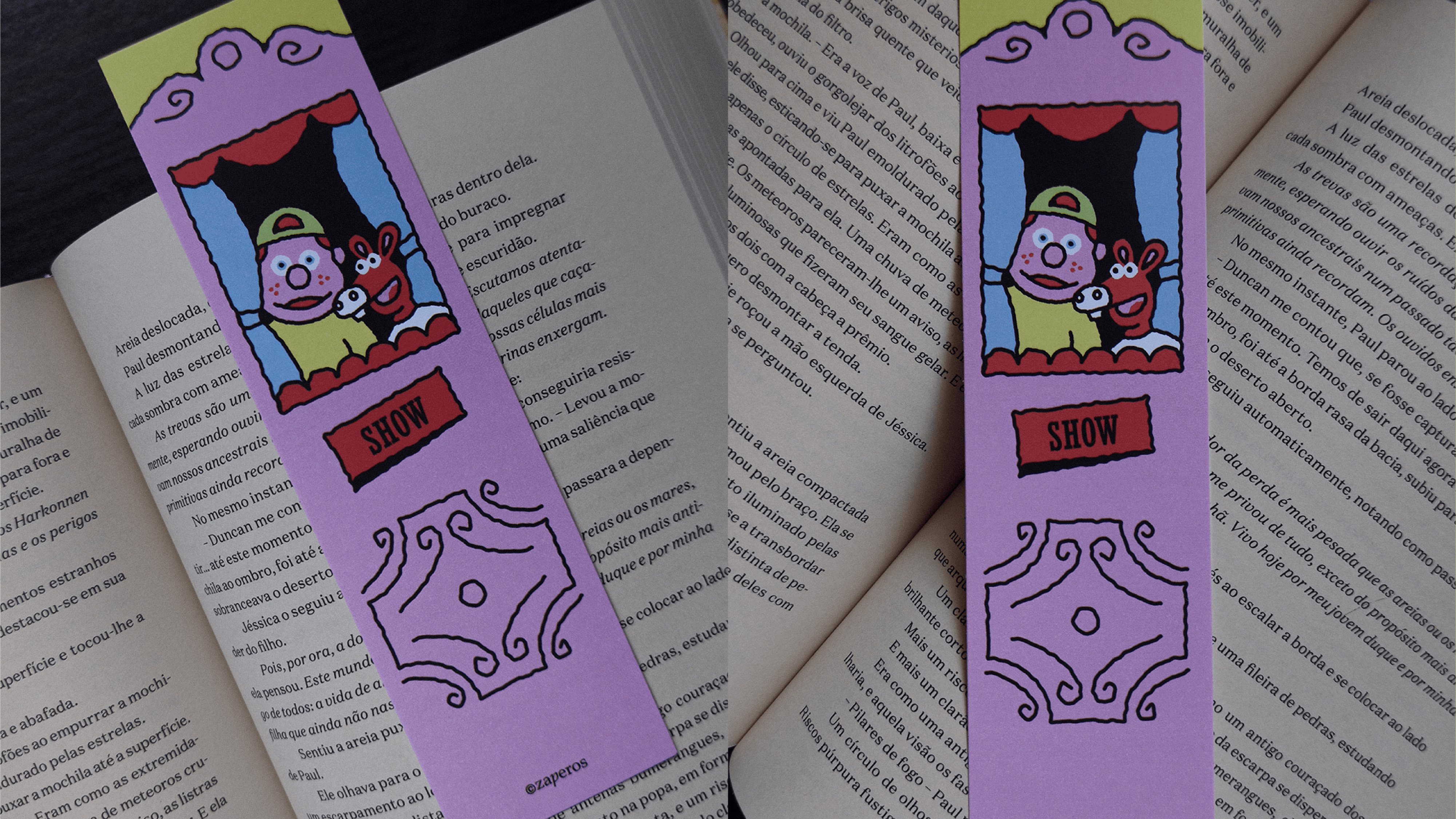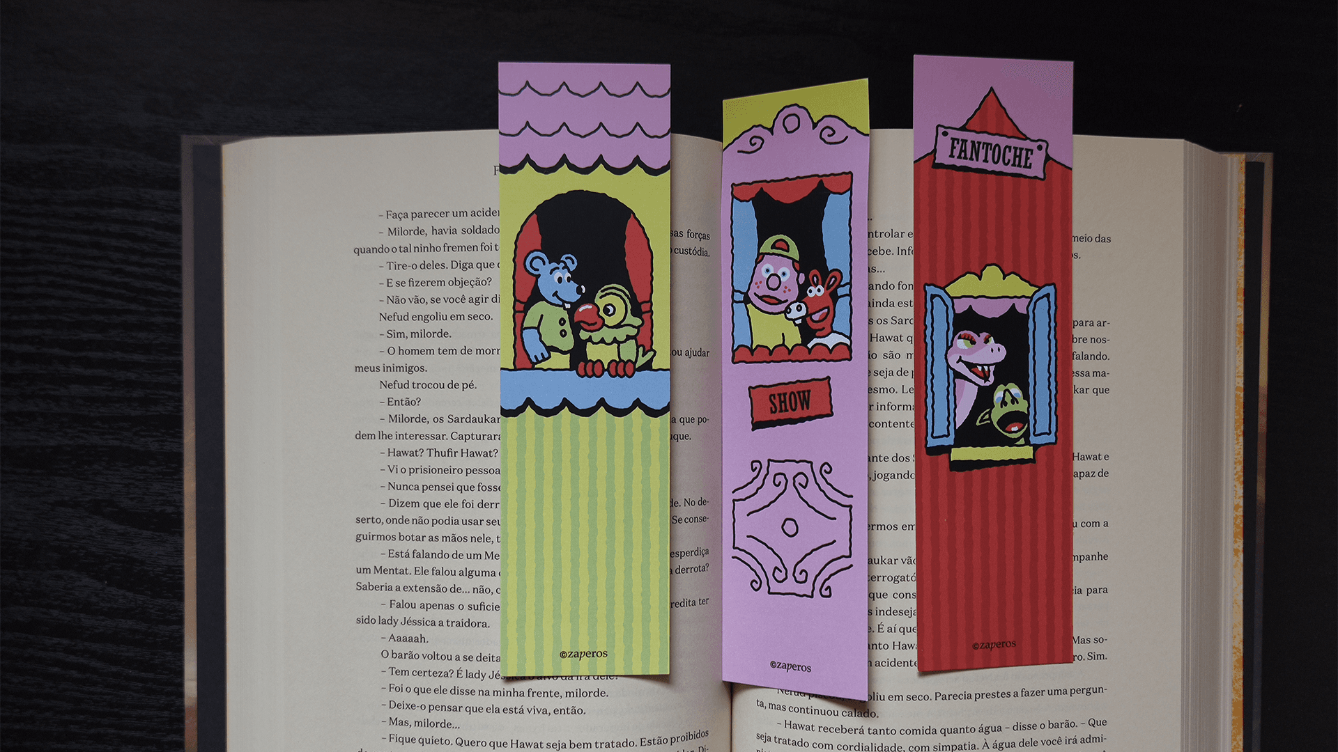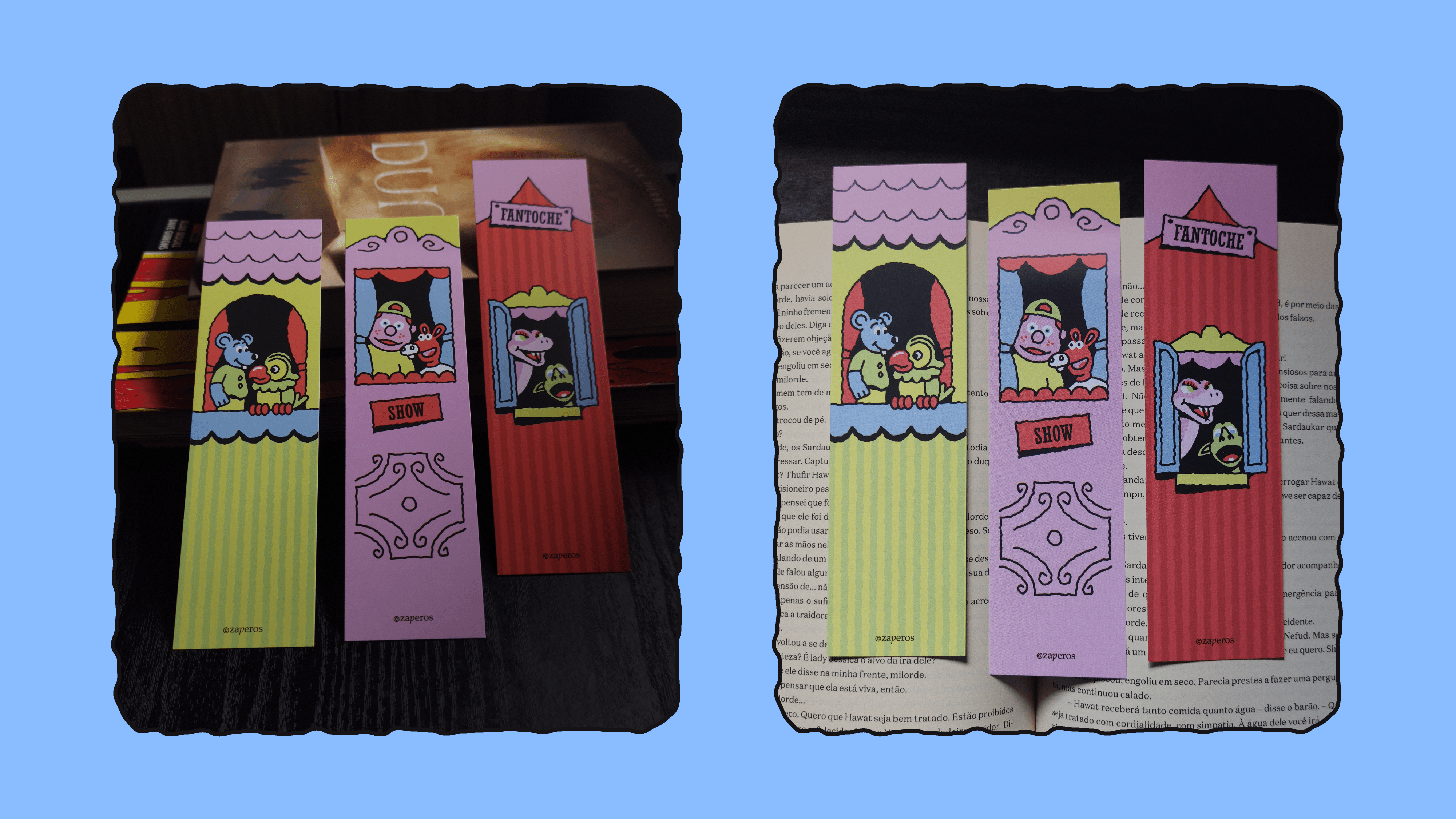 Pensando nisso, desenvolvi uma coleção de marca-páginas ilustrados, com o tema "Fantoches da TV Brasileira".